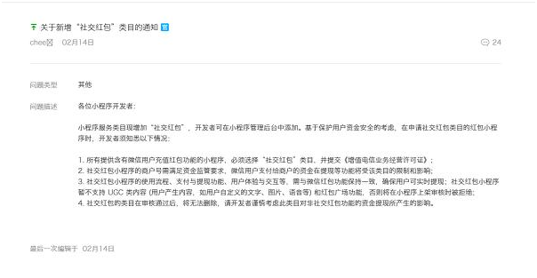 小程序新年也有新气象,2月14日,微信公众平台开发者社区置顶了《关于新增「社交红包」类目的通知》,小程序服务类目中将增加"社交红包",开发者可以在管理后台中添加。